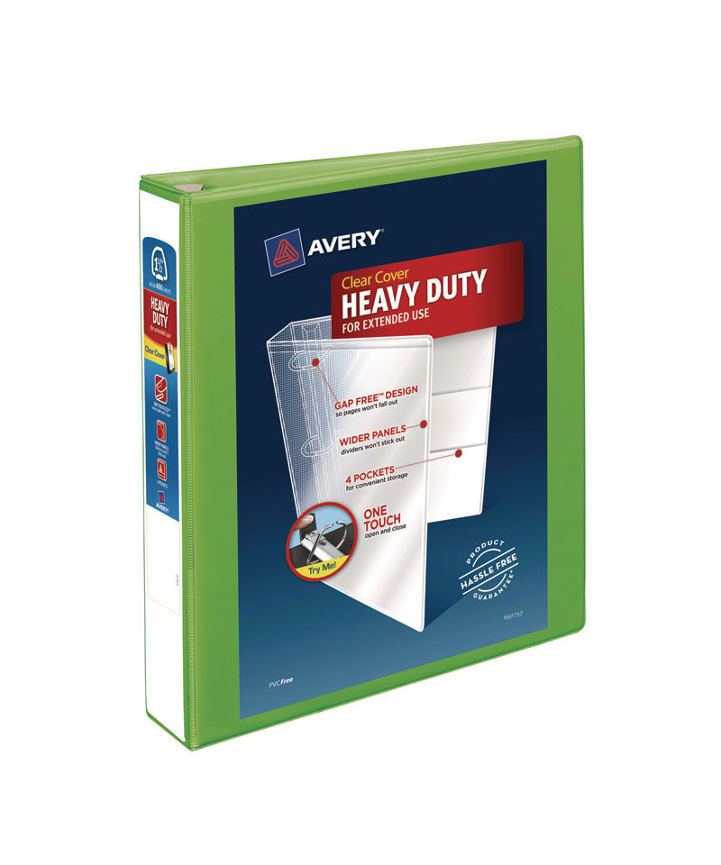 Heavy-Duty view binder with one touch EZD rings is perfect for long-term, regular use. Tear-resistant DuraHinge design is stronger and lasts longer. DuraEdge feature makes the sides and top more pliable, providing greater split resistance. Deep-textured film offers a smoother finish and features a linen pattern for a high-quality look and feel. Clear cover and spine for easy customization. Four clear, interior pockets provide extra storage space. Wider front and back panels fully cover standard dividers and sheet protectors. One touch EZD rings provide easy access and have a higher page capacity when compared to the same size round rings. Customize the cover with free, easy-to-use templates and designs at Avery Design & Print online.