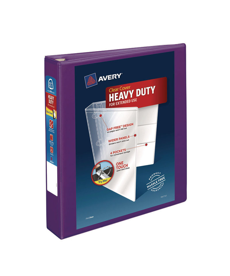 Heavy-Duty view binder with one touch EZD rings is perfect for long-term, regular use. Tear-resistant DuraHinge design is stronger and lasts longer. DuraEdge feature makes the sides and top more pliable, providing greater split resistance. Deep-textured film offers a smoother finish and features a linen pattern for a high-quality look and feel. Clear cover and spine for easy customization. Four clear, interior pockets provide extra storage space. Wider front and back panels fully cover standard dividers and sheet protectors. One touch EZD rings provide easy access and have a higher page capacity when compared to the same size round rings. Customize the cover with free, easy-to-use templates and designs at Avery Design & Print online.