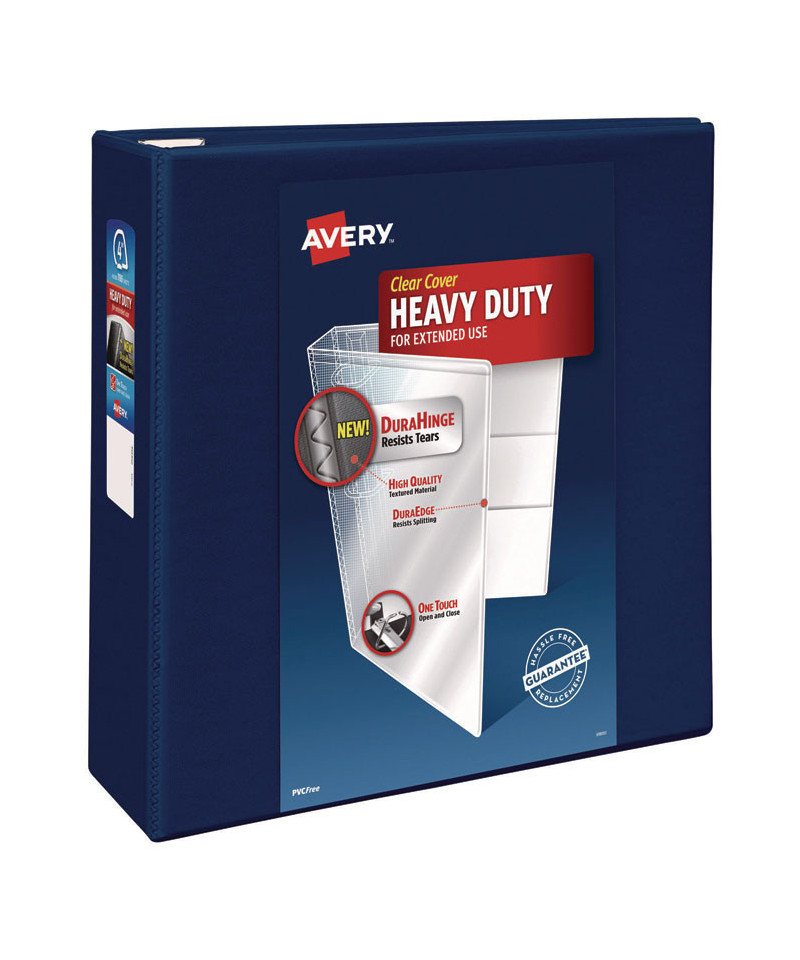 Heavy-Duty view binder with one touch EZD rings is perfect for long-term, regular use. Tear-resistant DuraHinge design is stronger and lasts longer. DuraEdge feature makes the sides and top more pliable, providing greater split resistance. Deep-textured film offers a smoother finish and features a linen pattern for a high-quality look and feel. Clear cover and spine for easy customization. Four clear, interior pockets provide extra storage space. Wider front and back panels fully cover standard dividers and sheet protectors. One touch EZD rings provide easy access and have a higher page capacity when compared to the same size round rings. Customize the cover with free, easy-to-use templates and designs at Avery Design & Print online.