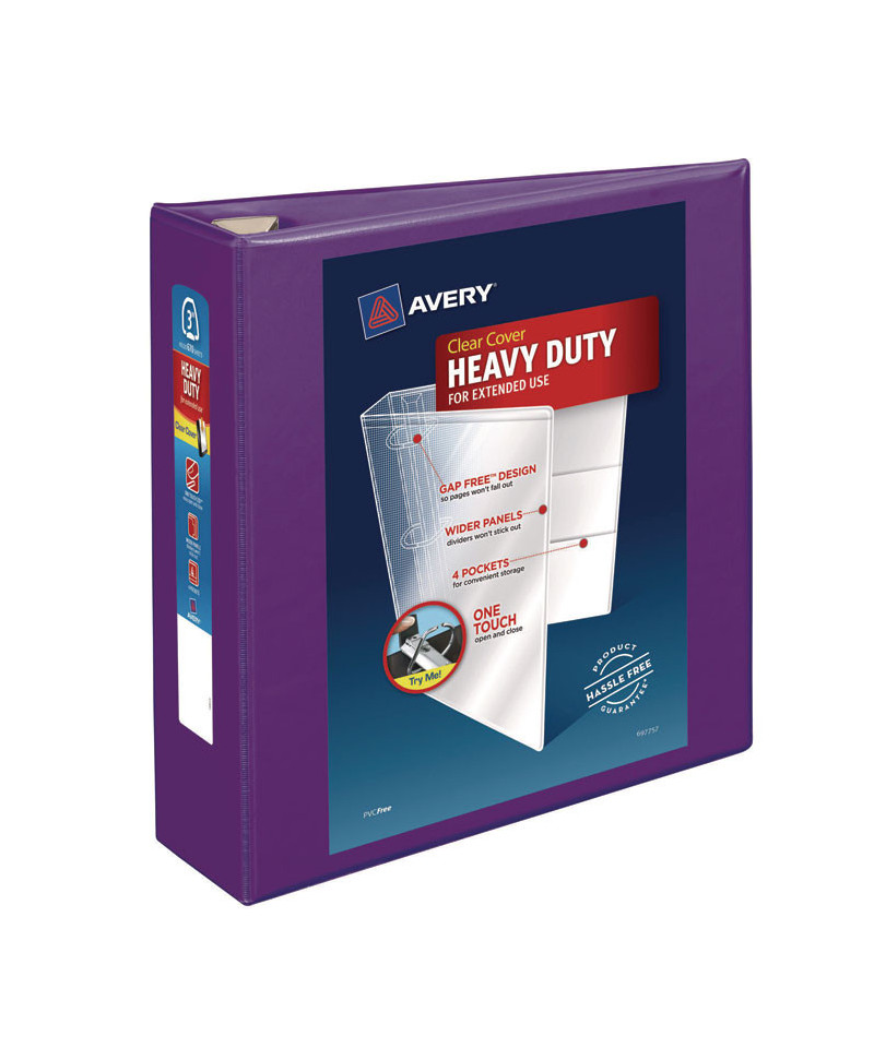 Heavy-Duty view binder with one touch EZD rings is perfect for long-term, regular use. Tear-resistant DuraHinge design is stronger and lasts longer. DuraEdge feature makes the sides and top more pliable, providing greater split resistance. Deep-textured film offers a smoother finish and features a linen pattern for a high-quality look and feel. Clear cover and spine for easy customization. Four clear, interior pockets provide extra storage space. Wider front and back panels fully cover standard dividers and sheet protectors. One touch EZD rings provide easy access and have a higher page capacity when compared to the same size round rings. Customize the cover with free, easy-to-use templates and designs at Avery Design & Print online.