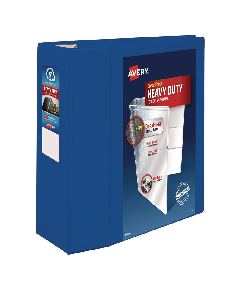 Heavy-Duty view binder with one touch EZD rings is perfect for long-term, regular use. Tear-resistant DuraHinge design is stronger and lasts longer. DuraEdge feature makes the sides and top more pliable, providing greater split resistance. Deep-textured film offers a smoother finish and features a linen pattern for a high-quality look and feel. Clear cover and spine for easy customization. Four clear, interior pockets provide extra storage space. Wider front and back panels fully cover standard dividers and sheet protectors. One touch EZD rings provide easy access and have a higher page capacity when compared to the same size round rings. Customize the cover with free, easy-to-use templates and designs at Avery Design & Print online.