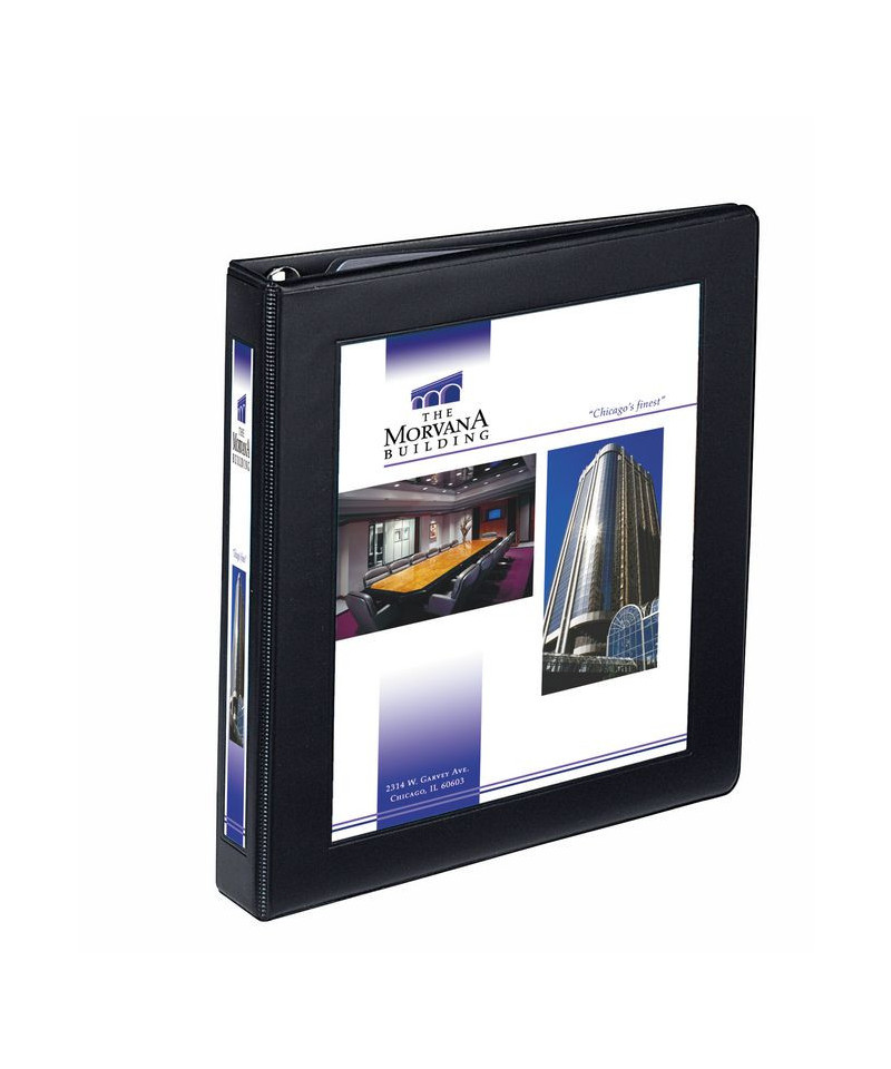 Border on front panel frames and centers title page for a professional look. Easily customize cover and spine using free designs and templates from Avery® Design & Print. Easily insert title page and spine ID with convenient mounting sheets. Two clear interior pockets and a business card pocket add to the professional image. Wider front and back panels fully cover standard dividers and sheet protectors. Pages lie flat with back-mounted rings (exposed rivets on back).