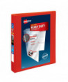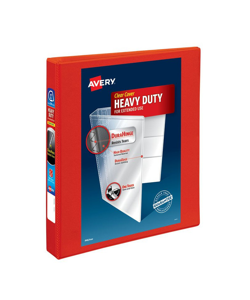 Heavy-Duty view binder with one touch EZD rings is perfect for long-term, regular use. Tear-resistant DuraHinge design is stronger and lasts longer. DuraEdge feature makes the sides and top more pliable, providing greater split resistance. Deep-textured film offers a smoother finish and features a linen pattern for a high-quality look and feel. Clear cover and spine for easy customization. Four clear, interior pockets provide extra storage space. Wider front and back panels fully cover standard dividers and sheet protectors. One touch EZD rings provide easy access and have a higher page capacity when compared to the same size round rings. Customize the cover with free, easy-to-use templates and designs at Avery Design & Print online.
