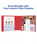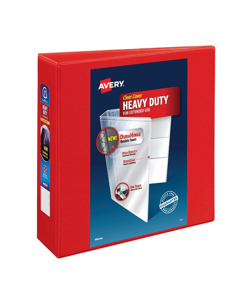Heavy-Duty view binder with one touch EZD rings is perfect for long-term, regular use. Tear-resistant DuraHinge design is stronger and lasts longer. DuraEdge feature makes the sides and top more pliable, providing greater split resistance. Deep-textured film offers a smoother finish and features a linen pattern for a high-quality look and feel. Clear cover and spine for easy customization. Four clear, interior pockets provide extra storage space. Wider front and back panels fully cover standard dividers and sheet protectors. One touch EZD rings provide easy access and have a higher page capacity when compared to the same size round rings. Customize the cover with free, easy-to-use templates and designs at Avery Design & Print online.