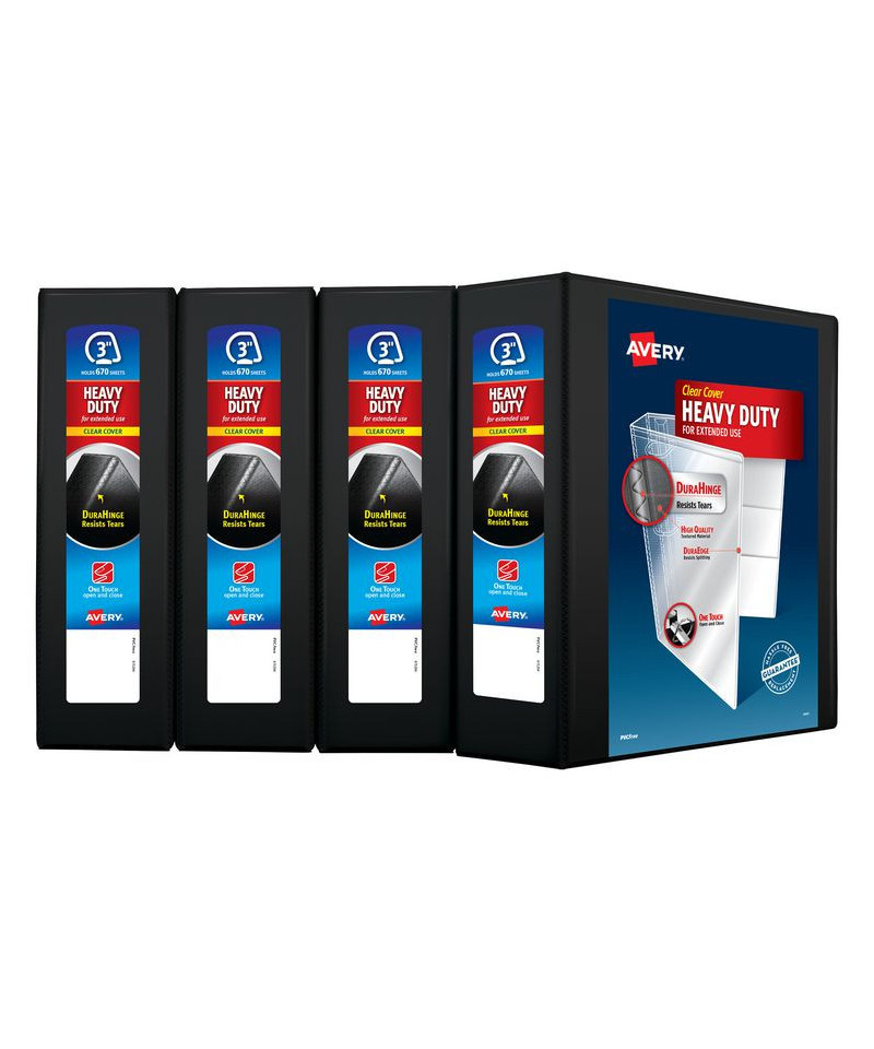Heavy-Duty view binder with one touch EZD rings is perfect for long-term, regular use. Tear-resistant DuraHinge design is stronger and lasts longer. DuraEdge feature makes the sides and top more pliable, providing greater split resistance. Deep-textured film offers a smoother finish and features a linen pattern for a high-quality look and feel. Clear cover and spine for easy customization. Four clear, interior pockets provide extra storage space. Wider front and back panels fully cover standard dividers and sheet protectors. One touch EZD rings provide easy access and have a higher page capacity when compared to the same size round rings. Customize the cover with free, easy-to-use templates and designs at Avery Design & Print online.