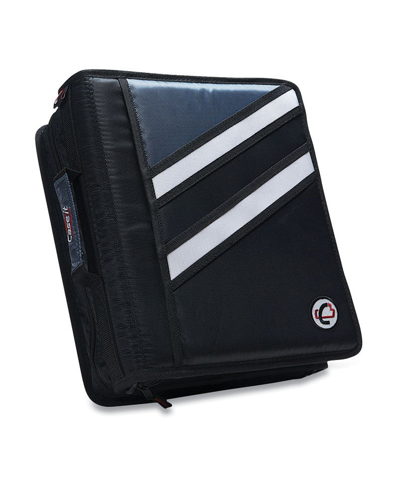 Get twice the organizational potential! Patent-pending Z-system provides dual sets of D-rings, pockets and pouches, essentially two separate binders in one unique package, where each side mirrors its opposite. Color-coded accents allow you to distinguish each of the two mirror images at a glance. Innovative, segmented design lays fully flat regardless of which side you wish to access. Zipper closure protects all contents safe from the elements while keeping loose items from slipping away. Puncture-resistant ripstop nylon covering features a square pattern that keeps tears from spreading. Rigid interior boards help prevent individual sections from buckling and warping. Handle and shoulder strap provide briefcase or messenger-bag transport versatility.