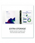 These three-ring binders make indispensable home, office, and school supplies offering the economical paper storage and organizational value you've been searching for. This important document binder features a clear overlay along the front, back, and spine, allowing you to customize your presentations, projects, and more. Non-stick materials are used to make this product, which prevents ink transfer or lifting copy when materials are inserted into the cover or placed inside. Three binder rings with double boosters hold 8.5 x 11 letter-sized sheets with ease. The rings are mounted on the back lid, allowing pages to lay flat while preventing wear and tear on documents. Two clear interior pockets provide additional storage with enough space for notes, photos, business cards, or full-size pag