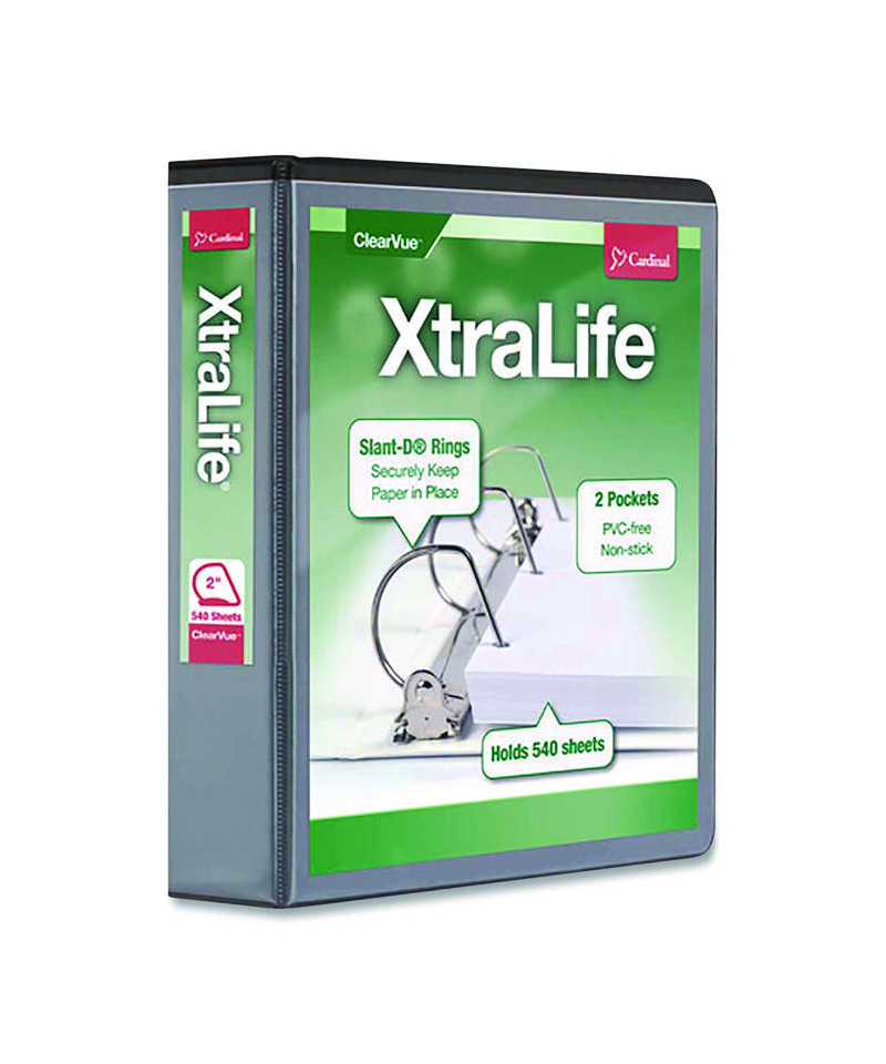 Cardinal® XtraLife® ClearVue™ Binders withstand frigid temperatures. Even in extremely cold weather, covers are guaranteed not to split or tear for three years. Slant-D® rings with nickel triggers hold 25% more sheets than standard round rings. Binders feature ClearVue™ covers for a customized front, back and spine. PVC free.