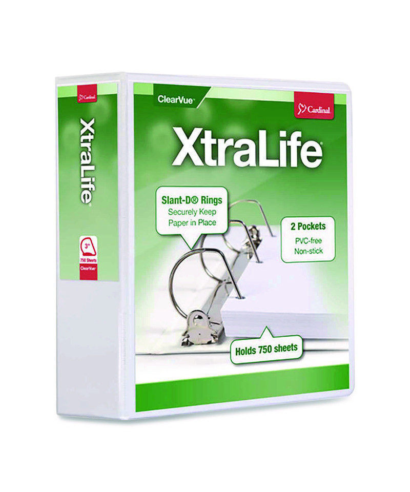 Cardinal® XtraLife® ClearVue™ Binders withstand frigid temperatures. Even in extremely cold weather, covers are guaranteed not to split or tear for three years. Slant-D® rings with nickel triggers hold 25% more sheets than standard round rings. Binders feature ClearVue™ covers for a customized front, back and spine. PVC free.