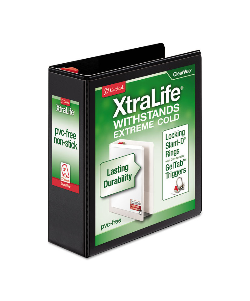Cardinal® XtraLife® ClearVue™ Binders withstand frigid temperatures. Even in extremely cold weather, covers are guaranteed not to split or tear for three years. Slant-D® rings with nickel triggers hold 25% more sheets than standard round rings. Binders feature ClearVue™ covers for a customized front, back and spine. PVC free.