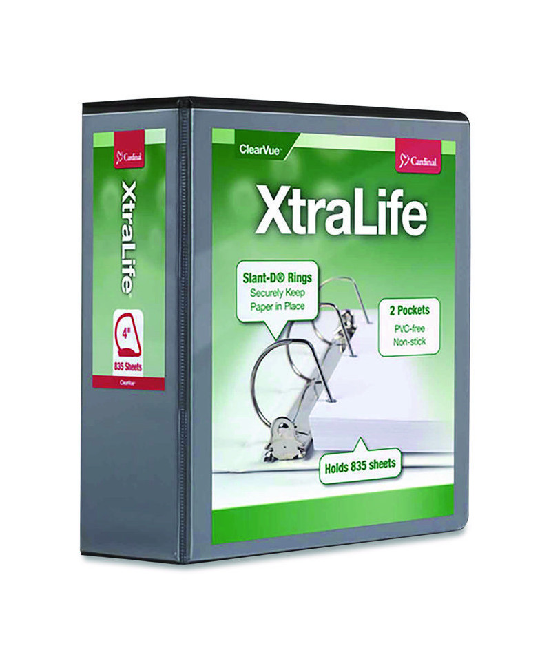 Cardinal® XtraLife® ClearVue™ Binders withstand frigid temperatures. Even in extremely cold weather, covers are guaranteed not to split or tear for three years. Slant-D® rings with nickel triggers hold 25% more sheets than standard round rings. Binders feature ClearVue™ covers for a customized front, back and spine. PVC free.
