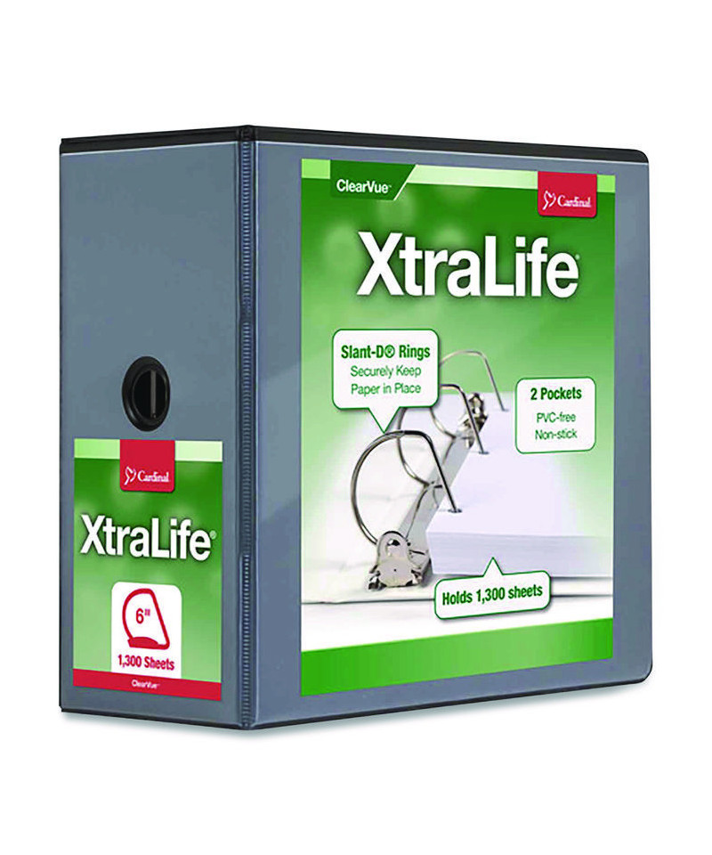 Cardinal® XtraLife® ClearVue™ Binders withstand frigid temperatures. Even in extremely cold weather, covers are guaranteed not to split or tear for three years. Slant-D® rings with nickel triggers hold 25% more sheets than standard round rings. Binders feature ClearVue™ covers for a customized front, back and spine. PVC free.