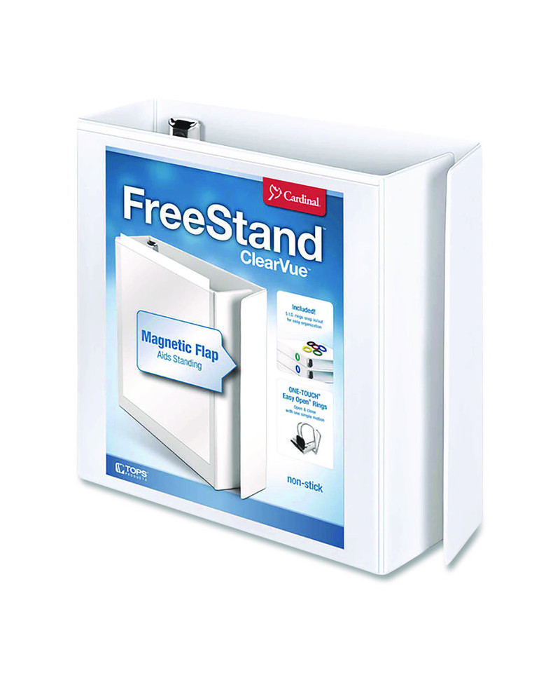 Magnetic flap closure stabilizes binder so it stands unaided. Five color ID rings snap in and out for easy identification. ONE-TOUCH® Easy Open® rings open, close and lock with one simple motion. Non-stick cover with clear overlay.