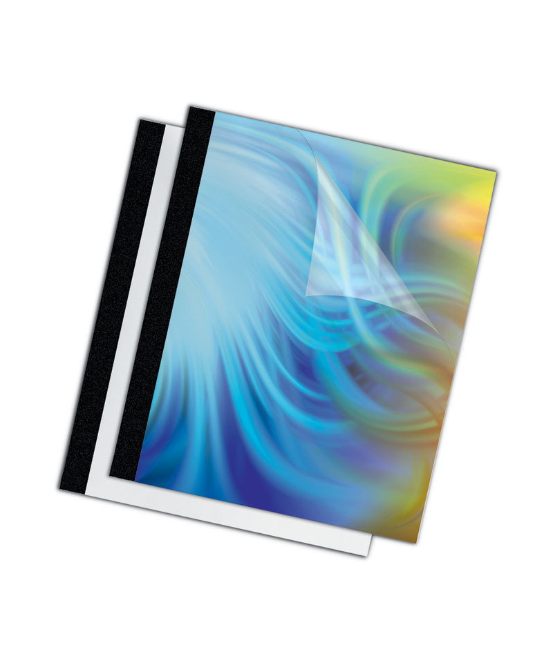 Presentation covers for thermal binding systems. Transparent front cover highlights title page. Elegant back cover in glossy white or linen-textured black. Compatible with most thermal binding systems.
