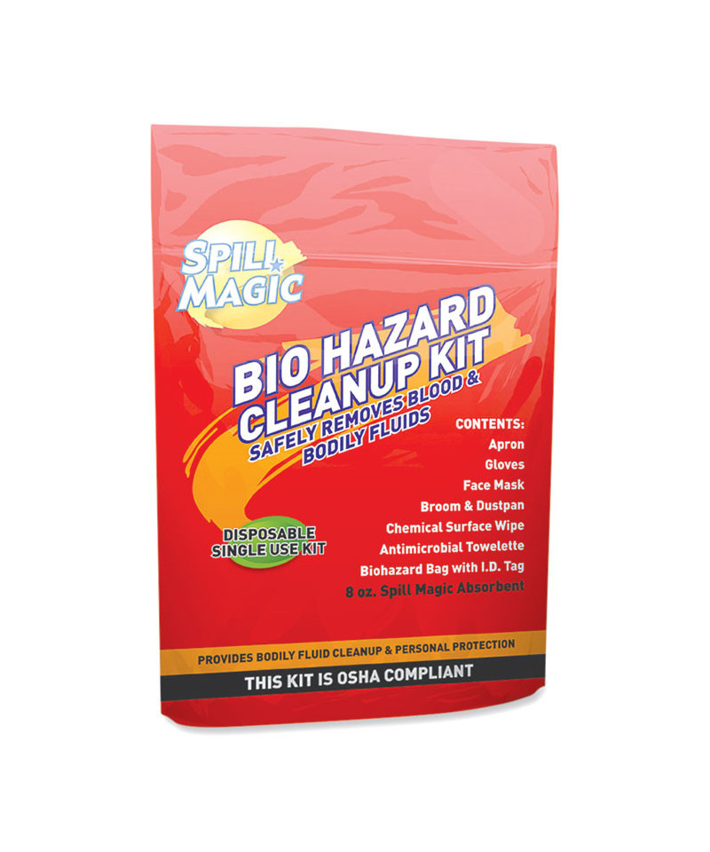 This single-use bio-hazard cleanup kit safely removes blood and bodily fluids. Kit includes essential items needed to safely clean-up and dispose of bodily fluids, blood and other substances. It is quick and easy to use on small to midsize biohazard spills. Ideal to have on hand at home, in a school or a restaurant or any location where there may be an accident of bodily fluids or blood accidents may occur. This powder works on several surfaces such as asphalt, concrete and tile surfaces. After clean up, it leaves the surface clean and dry, with no spill residue.