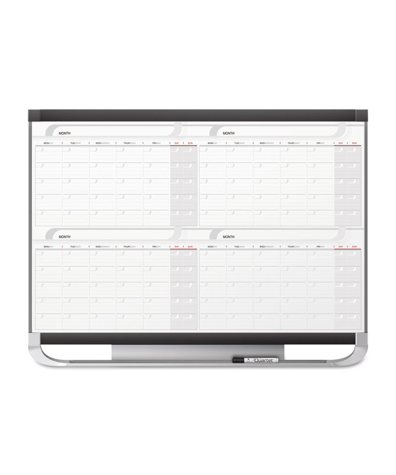 Planning and organizing for a busy office can be stressful. A Total Erase® magnetic calendar board allows you to display a long-term schedule all in one place and make changes on the fly with ease. The coated Total Erase® surface is extremely durable and will not ghost or stain. Four-month calendar design effectively keeps you organized well in advance. This convenient calendar board frame is also compatible with Prestige® 2 Connects accessories. Attach accessories directly to the board frame and always keep markers, flipchart holders and more within easy reach. Includes one dry-erase marker and mounting hardware for fast, accurate wall hanging.