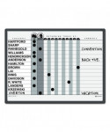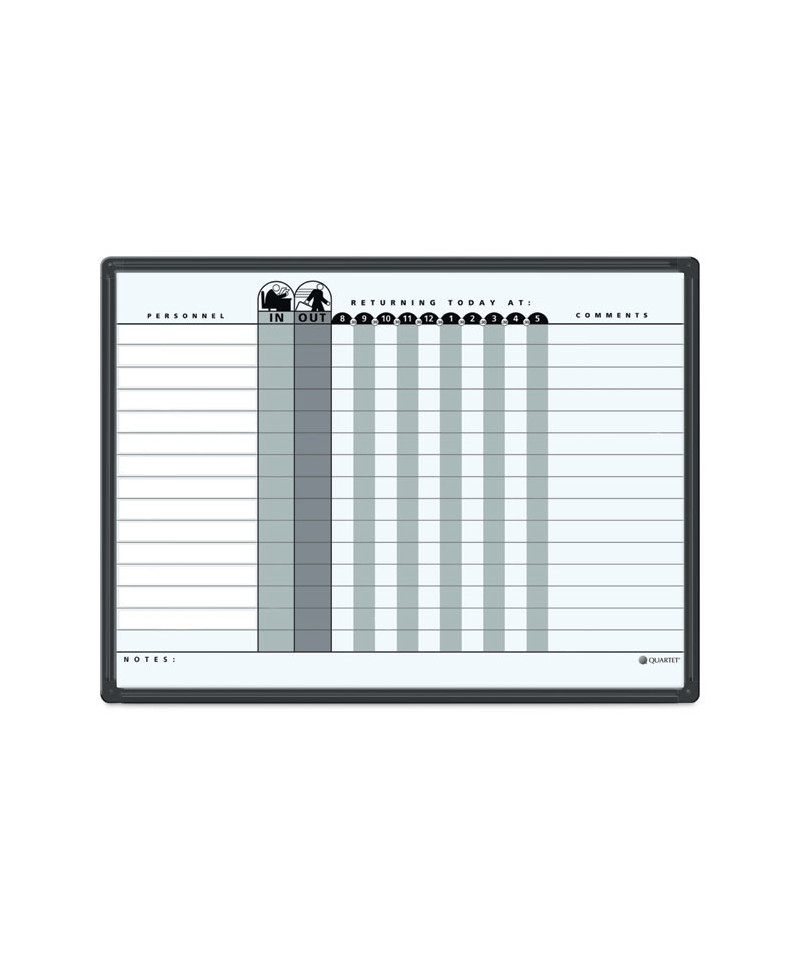 Personnel board tracks in/out status and notes of your employees on an ultra-durable, ultra-smooth DuraMax® porcelain surface that will not scratch, dent, stain or ghost. Delivers superior performance when communication is needed in high-profile, heavy-use office environments. Steel-backed porcelain creates magnetic surface for posting documents. Effectively display information on easy-to-read grid lines with alternating gray shading. Easy-to-clean writing surface requires minimal use of Quartet® cleaning solutions. Easily secure board to wall with included mounting system. Contemporary black aluminum frame complements any office decor. Includes accessory magnets and one marker.