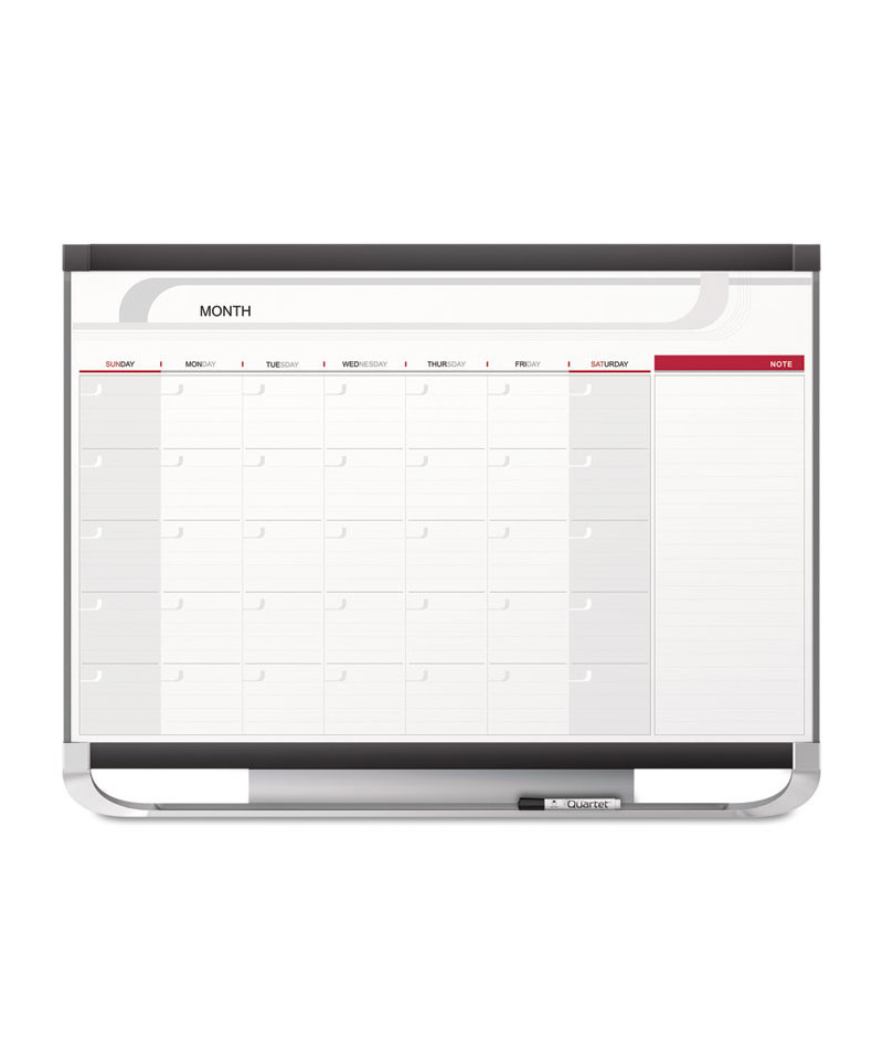 Planning and organizing for a busy office can be stressful. A Total Erase® magnetic calendar board allows you to display your monthly schedule all in one place and make changes on the fly with ease. The coated Total Erase® surface is extremely durable and will not ghost or stain. One month calendar design effectively manages four weeks at once. This convenient calendar board is also compatible with Prestige® 2 Connects™ accessories. Attach accessories directly to the board frame and always keep markers, flipchart holders and more within easy reach. Includes one dry-erase marker and mounting hardware for fast, accurate wall hanging.