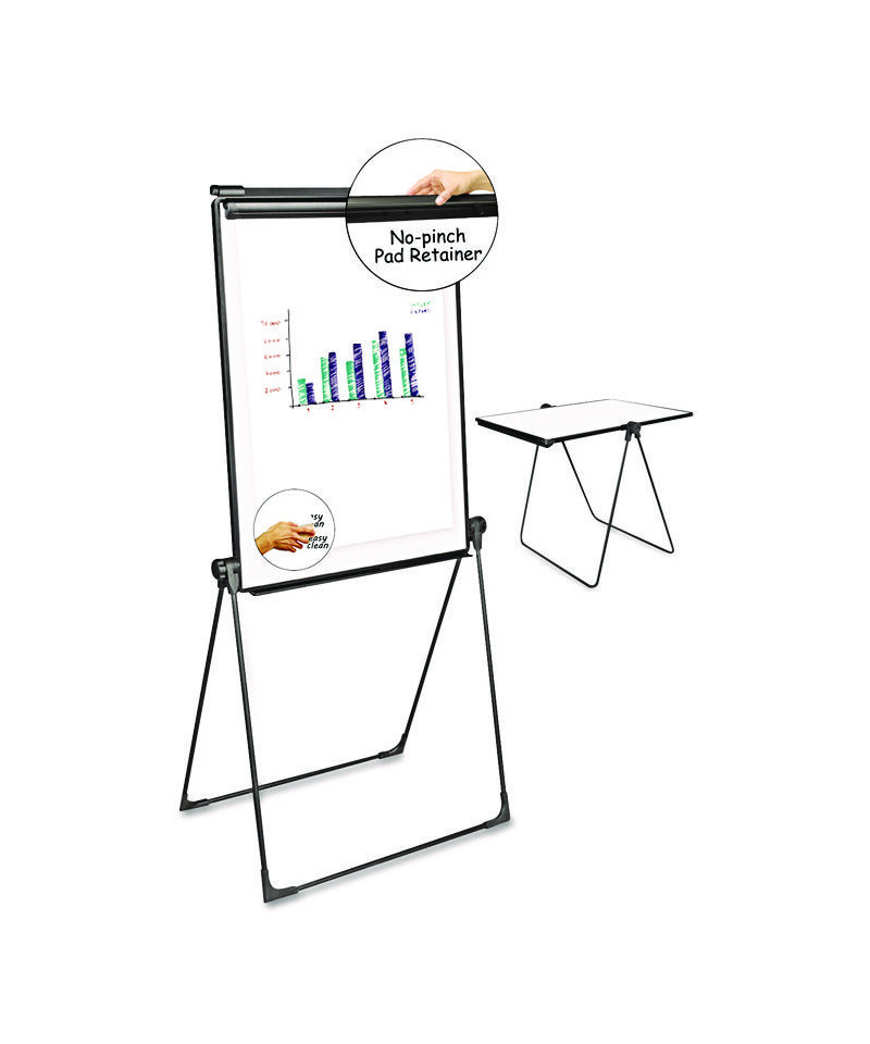 Double-sided, melamine dry-erase board features no-pinch retainers with adjustable pad hooks to accommodate any size easel pad. Stable, tubular-metal easel frame enables two configurations: presentation board and tabletop worksurface. Great for hotels, schools, libraries, hospitals, executive offices, conference rooms, board rooms and more. Folds flat for storage. Tabletop worksurface configuration height: 42". Presentation-board configuration height: 67".