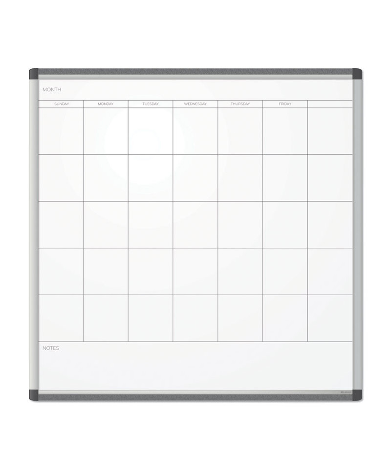 Silver aluminum PINIT frame magnetic dry erase calendar board is a perfect and functional solution for the frequent usage areas of your office, school classroom, home or any commercial space. Although all dry erase markers work well with this board, the U Brands dry erase markers provide the ultimate writing and eras-ability experience. Magnetic painted steel writing surface will require minimal ongoing cleaning care to ensure the best performance and resist ink staining and ghosting. Monthly view enables you to keep track of your hectic schedule. Simply use any dry erase board spray or wet dry erase board wipes after continuous use to clean the writing surface. Magnetic writing surface functions as a bulletin board as well; simply use any board magnets to pin all of your notes, messages, pictures, memos, calendars, menus, reminders and more. You may also attach all U Brands magnetic board markers and accessories (sold separately) to the board surface without using the marker tray. Strong and thick insulation underneath the dry erase surface, combined with the aluminum frame provides a firm and rigid construction. Whiteboard has a universal mounting system, as it can be hung horizontally.