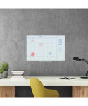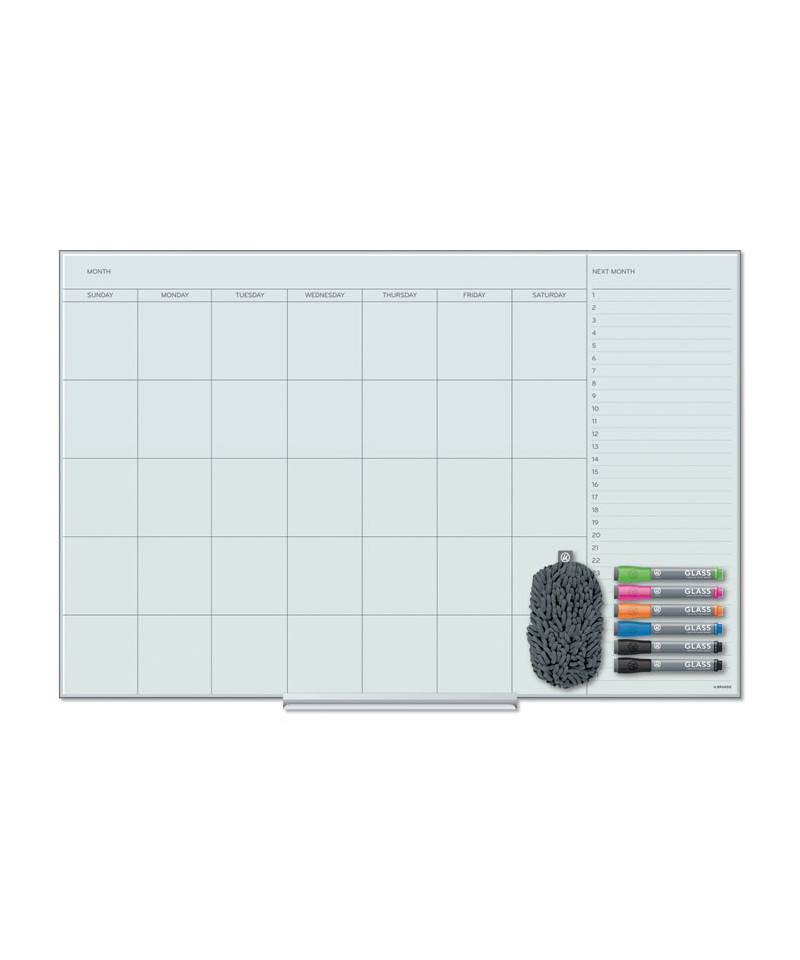White frosted dry erase calendar board is a perfect and functional solution for the frequent and heavy usage areas of your office, school classroom, home or any commercial space. Clean, contemporary and frameless product design lines will add a touch of subtle style to your wall. The modern frameless feature enables you to hang multiple glass boards adjacent to each other and expand the writing surface to fit your custom space needs. The board's premium ultimate glass writing surface will never stain or ghost. Monthly view enables you to keep track of your hectic schedule. All ink erases easily with a simple eraser and the glass surface continuously outperforms all traditional melamine or painted steel dry erase writing surfaces. Occasionally, use any dry erase board spray or wet dry erase board wipes after continuous use to clean the writing surface. Although all dry erase and glass markers work well with this board, the U Brands dry erase markers provide the ultimate writing and eras-ability experience. For safety, the board is made from tempered glass as well. Modern frameless design includes hidden mounting brackets that give the impression that the board is floating on the wall. Mounting hardware and instructions are included for quick and easy mounting. The board is packaged with extra supportive corrugate material that is highly resistant to damage during shipping; all corrugated material can be recycled once unpacked.