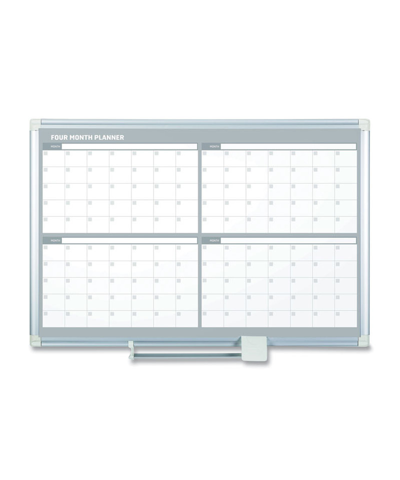 Magnetic Dry Erase Calendar Board, Four-Month Planning/Scheduling, 48" x 36", White Surface, Satin Aluminum Frame