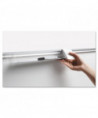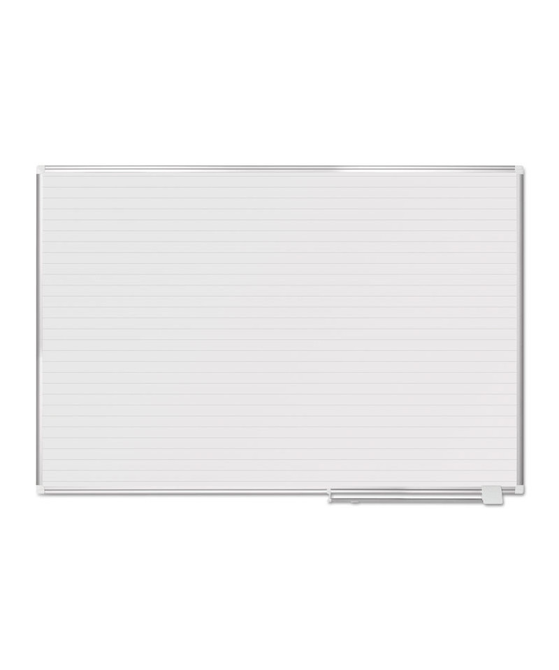 Pale gray rule lines simplify text and magnetic accessory alignment. Magnetic lacquered steel dry erase surface is recommended for frequent use. Sturdy aluminum frame features a sliding pen tray and an easy four-corner mounting system.