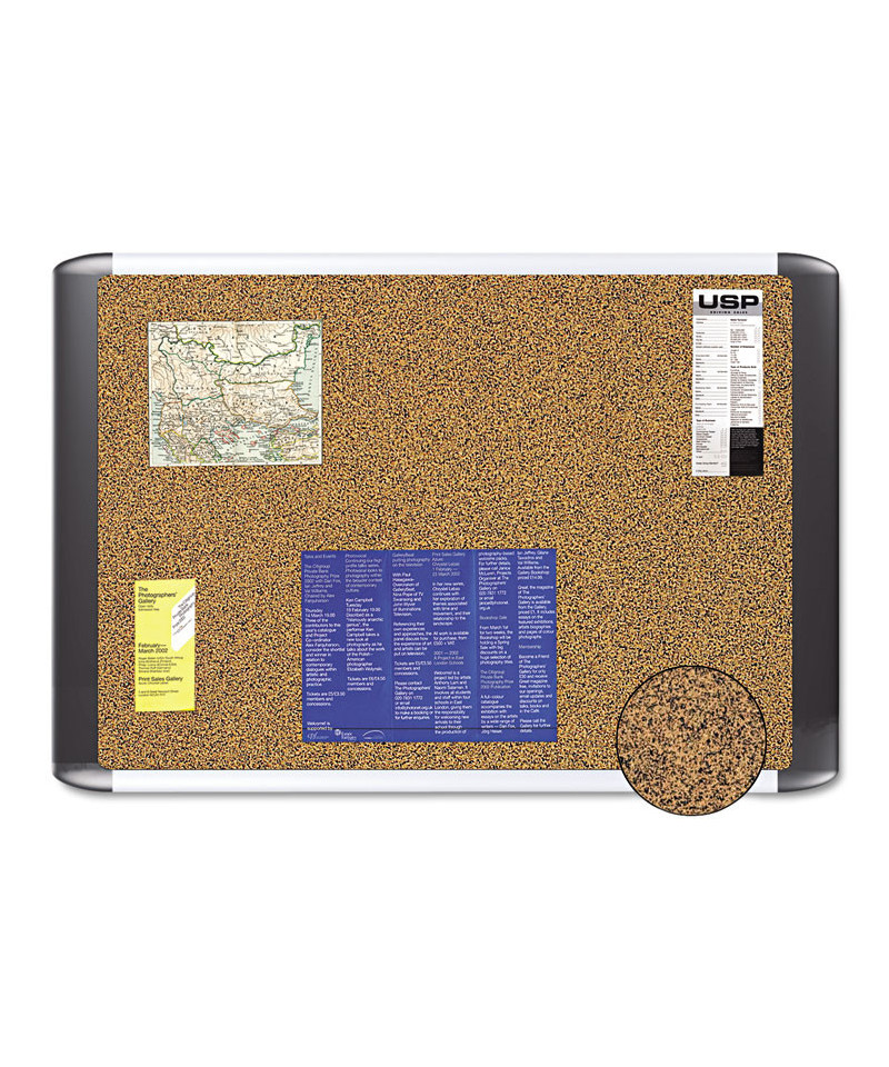 Tech cork is a special self-healing bulletin board surface based on a fine blend of cork and rubber. Thick and extremely resilient, the unusual surface offers a texture that gives these boards a contemporary look while providing years of use. The aluminum and plastic contemporary frame enhances any office environment.