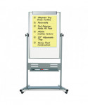 Revolving double-sided dry erase mobile presentation easel is heavy-duty and reversible. It features a Magnetic Gold Ultra™ lacquered steel surface on both sides. Extra-large repositionable steel pen tray can be positioned in several places. Tubular steel frame, support bars and easy glide locking castors make this one of the most stable large mobile easels in the marketplace.