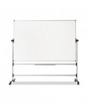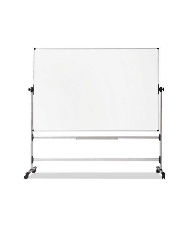 Durable and versatile dry erase boards are perfect for classrooms and all training environments. Silver Easy Clean surface resists ghosting. Dual surfaces revolve easily, providing you with additional writing space. Portable with easy glide locking casters for full mobility. Extra large steel repositionable pen tray can be easily relocated to different places. Steel tubular frame and support bars with extra stability bar prevent wobbling. Plastic removable easel pad clips included. The smart design and clean lines will complement any work space. Mobile and practical, they ensure the audience's attention while adapting to any room.