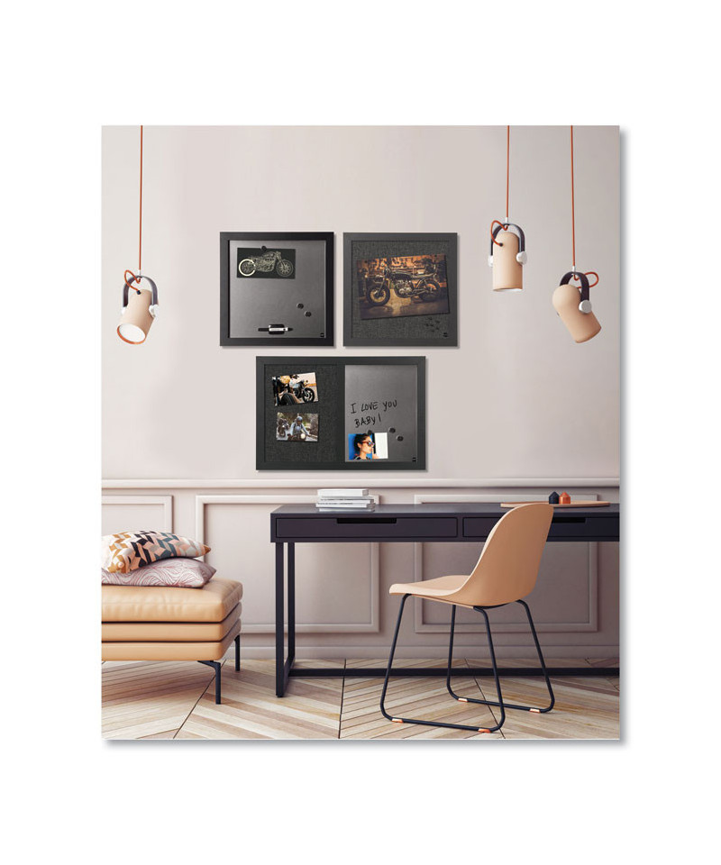 Black Shadow Set-Includes one 18" x 18" silver-finish magnetic dry erase board, one 18" x 18" checkered natural/white cork bulletin board and one 18" x 24" silver-finish dry erase/fabric bulletin combination board