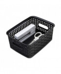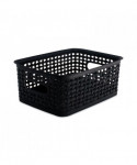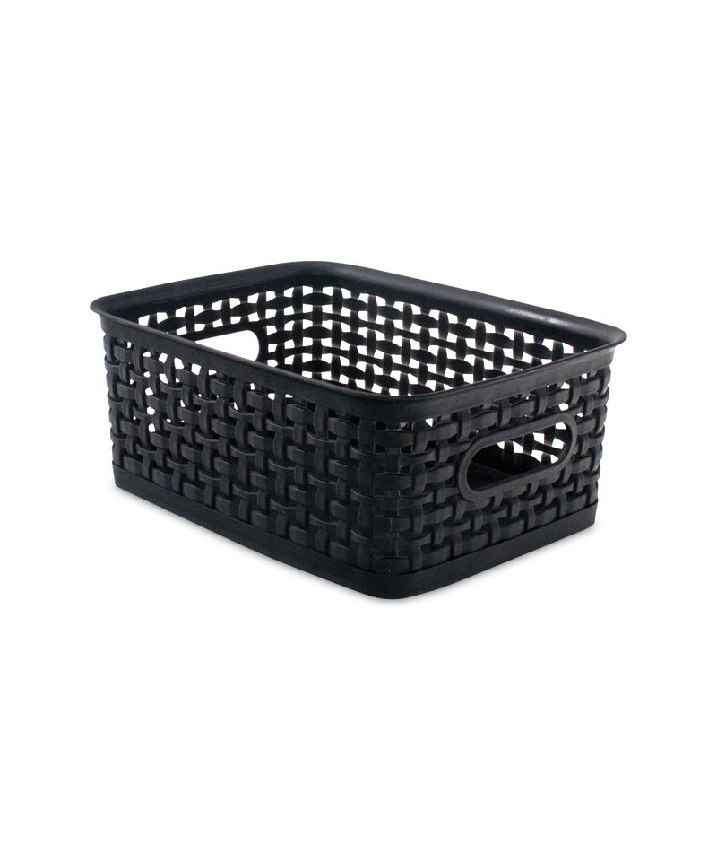 The perfect storage solution and balance of function and fashion, the plastic weave bin declutters any home or office environment. Constructed of sturdy black plastic, this bin can store pretty much anything. The classic black color will blend into any room.
