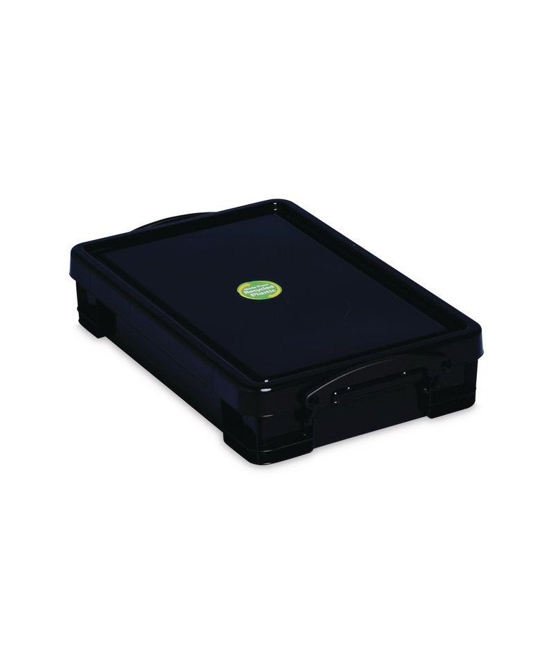 The Really Useful Box storage tote features handles with clip locks to secure the lid, offering convenient storage for your documents and utensils. The box is extremely durable and is made of 100% recycled plastic.