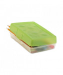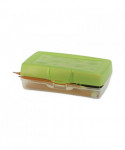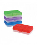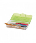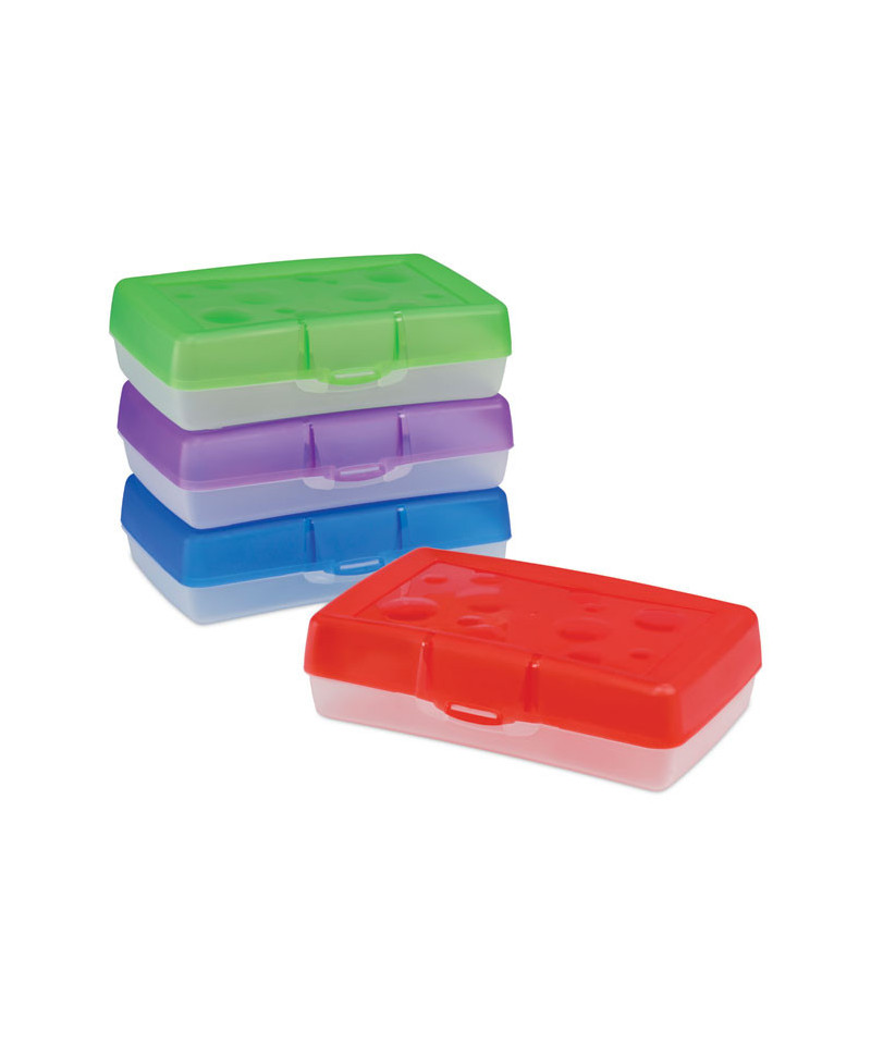 This pencil box had a solid one-piece construction using advanced plastic molding techniques. It has a clear bottom which allows for easy content identification, a colored top as well as a secure latch and hinge.
