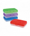 Features a solid one-piece construction using advanced plastic molding techniques. It has a clear bottom and a colored top as well as a secure latch and hinge.