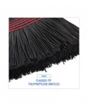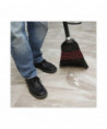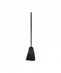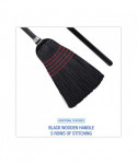 Convenient size janitorial or housekeeping broom for light-duty sweeping. Stiff, tightly packed bristles get into nooks and crannies while pushing dust and debris. Composed of a wooden handle with flagged-tip, polypropylene bristles for added durability. The four rows of stitching and metal wrapping provided strength and dependability. Black color blends seamlessly into contemporary environments. Lightweight and portable for added mobility. Great for hotels, restaurants, lobbies, and household sweeping on a variety of floor types.