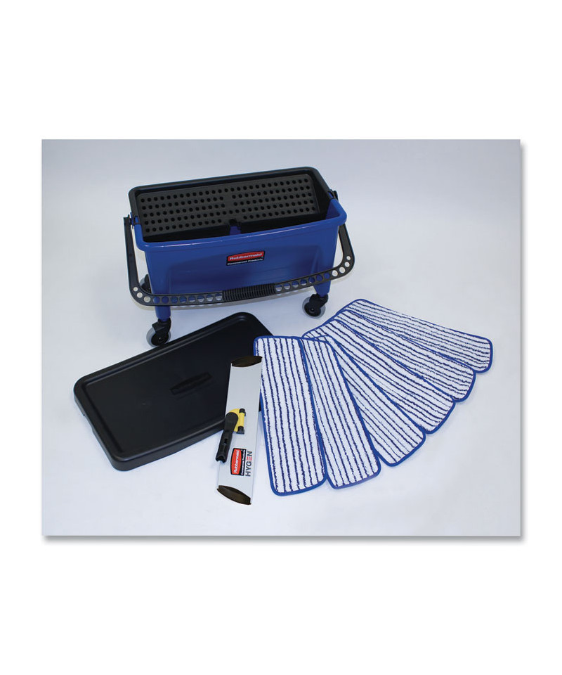 Minimize the potential for contamination by dedicating a color-coded system for floor finishing tasks. Kit includes almost everything you need to get started: finish pads, mop head frame, bucket and lid for storing everything together. When used in combination with Quick-Connect handles (sold separately), each piece works together to ensure smooth and even finish application. Foam-lined microfiber pads soak up more finish than standard mop heads while providing better liquid-release control. Angled, washboard-surfaced bucket wall simplifies excess finish removal. Bucket's lip-mounted handle-sized notches keep mops upright and ready for use. One-step-change Quick-Connect frame helps reduce set up time.