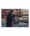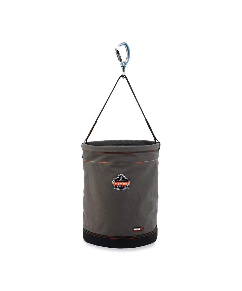 Extra-large durable 24 oz canvas main material, synthetic leather bottom bucket with storm drains. Webbing handle for strength and durability with double-action swiveling carabiner with captive eye.