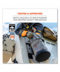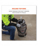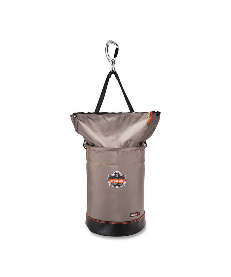 The Arsenal 5974 Large Nylon Hoist Bucket Tool Bag is certified to the ANSI/ISEA 121-2018 dropped object prevention standard for safely hoisting, storing and accessing tools while working at heights. Made primarily of 1200D nylon plus an 840D nylon top, synthetic leather bottom and heavy-duty YKK zipper closure this hoist bucket is built for long-lasting durability. In addition to the zippered closure, the top ring of the bucket is molded to maintain a wide opening for easy viewing and access to tools. An interior pocket is also included for tool organization. The high-tensile webbing handle is reinforced with leather and tarpaulin. This tool bucket is hoisted via a double action swiveling carabiner. Rigorously tested and approved to the ANSI/ISEA 121-2018 standard for dropped object prevention. Hoist bucket is third-party certified to 5:1 safety factor statically (2:1 dynamically) with a maximum safe working capacity of 100 lb.