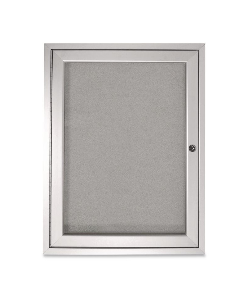 Ghent's Enclosed Vinyl Bulletin Board is the perfect way to display messages, pictures, and important information securely. The message center is made with a vinyl tack surface that hides pin holes and holds up under repeated tacking, providing years of reliable service. When used outside, this vinyl board will not break down or mold, unlike cork enclosed boards. You do not have to worry about damage from weather or humidity as long as you hang the board under an awning or overhang. This 1-door enclosed bulletin board is protected using shatter-proof acrylic panels, full-length door hinges, and locks that are flush with the frame. You can install the board in high-traffic, public areas without worrying about damage or tampering. Hidden corner brackets allow the message center to sit flush against the wall without any visible hardware which adds protection from vandalism. The colored vinyl surface is paired with a satin aluminum frame and includes two keys. Perfect for indoor and outdoor use.