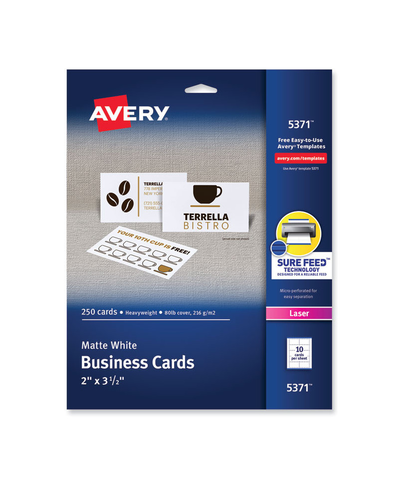Design and print business cards, appointment cards and more. Card sheets with Sure Feed® technology are designed to prevent jams and misalignments. Sturdy cardstock with ultra-fine perforations is printable on both sides. Easy to customize with free designs and templates from Avery Design & Print. 8.5" x 11" sheets for laser and inkjet printers.