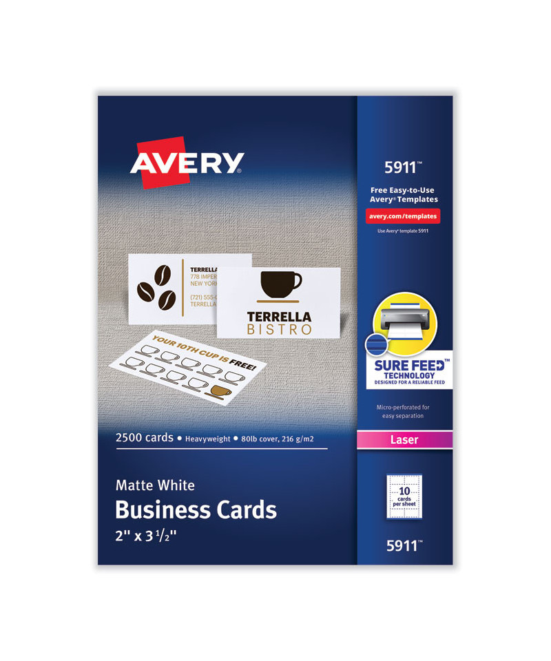 Make the right impression every time with customizable business cards. It's easy to create these do-it-yourself business cards. Start with the free blank and pre-designed templates from Avery Design & Print, then customize your card with your own personal touch. The heavyweight card stock prints easily from your printer and separates cleanly thanks to ultrafine perforations. Card sheets with Sure Feed® technology are designed for a reliable print and to prevent jams and misalignments. You'll get professional-looking business cards that look like they came from a print shop. What will your business card say about you? Card size 2" x 3.5". Sheet size 8.5" x 11".