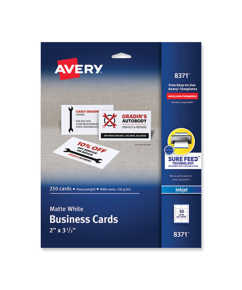 Design and print business cards, appointment cards and more. Card sheets with Sure Feed® technology are designed to prevent jams and misalignments. Sturdy cardstock with ultra-fine perforations is printable on both sides. Easy to customize with free designs and templates from Avery Design & Print. 8.5" x 11" sheets for laser and inkjet printers.