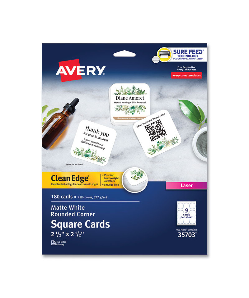 Use square cards with rounded corners to make your cards stand out. Customizable business cards offer an impressively substantial look and feel, while the curved corners help avoid snagging and creasing. White business cards have innovative Clean Edge technology for quick and easy separation and clean, smooth edges. The unique Sure Feed technology helps reduce misalignments, minimize paper jams, and avoid wasted projects when printing. Whether you have your own design or you're creating one from scratch, take your brand or business to the next level with Avery Design & Print Online, which makes it easy to create and print double-sided customized cards. The free browser-based software has everything you need to design business thank you cards, mini RSVP cards, reward cards, cute business cards and more.