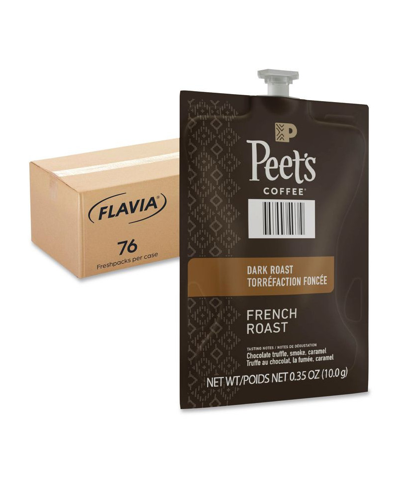 Peet's® darkest roast is intensely bold and flavorful with pronounced smoky overtones and a pleasant bite. Only top-quality Arabica beans from the highest altitudes of prime Latin American growing regions are selected for the French Roast. Our brewing process, where nothing touches the ingredients other than hot water, ensures your drink does not taste like previous brews. Compatible with FLAVIA® single-serve brewers. For single-serve sustainability, innovative pouches are 100 percent recyclable through Terracycle.
