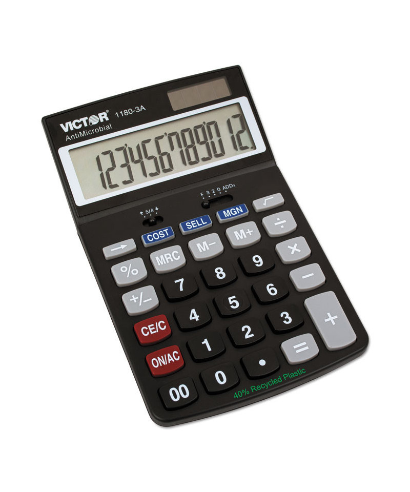 12-digit business calculator is perfect for the home or office. Features an extra large, easyt-to-read angled LCD display. This calculator is engineered with an Antimicrobial agent to reduce the growth of microbes and bacteria on the product that can cause discoloration and odors. Manufactured with recycled plastic. Cost/sell/margin keys for quick and easy profit calculations (enter two variables and the third automatically appears). Other functions include: item count, selectable decimal and rounding slide switches, backspace key, percent key, square root key, change sign key, 3-key independent memory, and automatic constants. Operates on hybrid power (solar with battery backup).