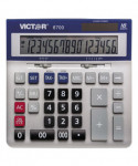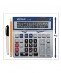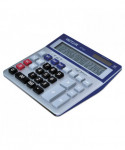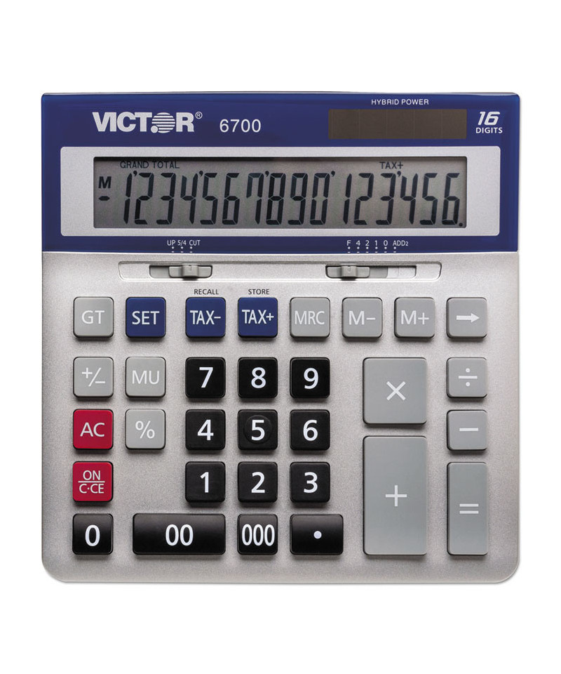 Sixteen-digit extra large desktop calculator with sleek metallic design. Functions include: tax keys, mark up key, grand total key, selectable decimal and rounding switches, percent key, automatic constants, backspace key, three-key independent memory and hybrid power.
