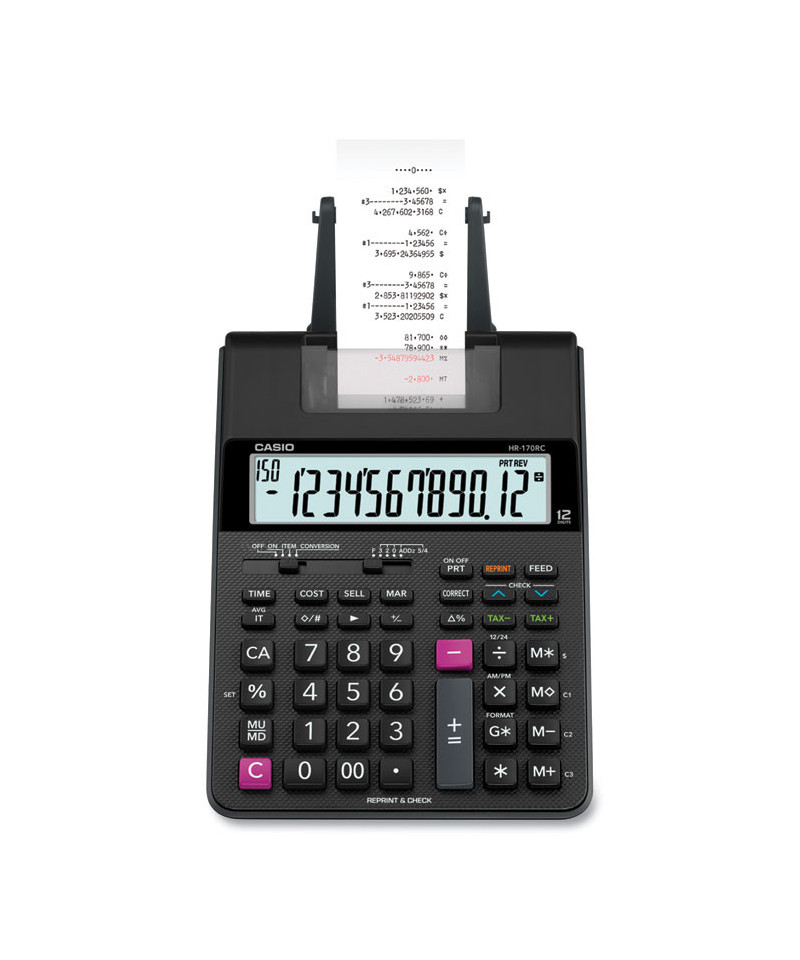 This desktop printing calculator prints 2.0 lines per second with two-color printing and Cost/Sell/Margin functionality. Check and correct up to 150 steps and print after correction. Clock and calendar function prints time and date.