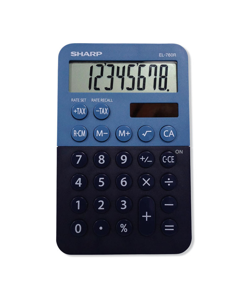 Eight-digit professional desktop calculator is perfect for business professionals at home or in the office. The EL-760RBBL has a two-tone light and dark blue design and features a large angled LCD display and durable plastic keys. Functions include: automatic tax keys, percent key, square root key, 3-key independent memory, larger plus key, sign change, and automatic power down. Operates on twin power (solar/battery backup).