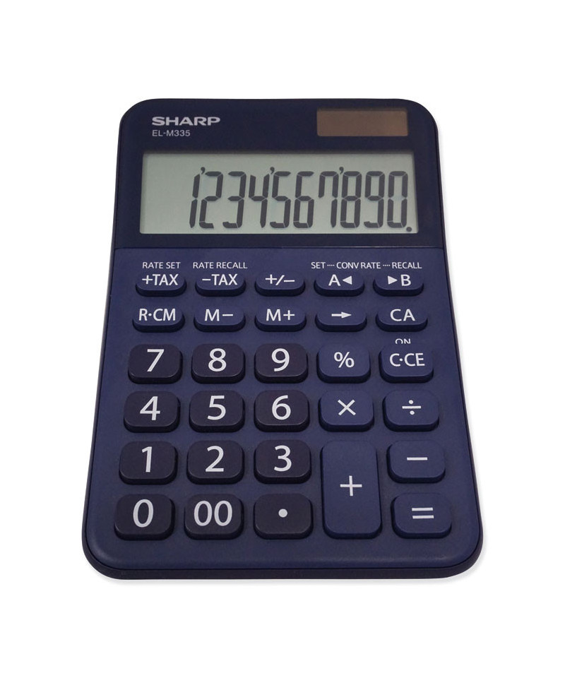 Ten-digit professional desktop calculator is perfect for business professionals at home or in the office. The EL-M335BBL is finished in a dark blue design and features a large angled LCD display and durable plastic keys. Functions include: currency conversion functions, automatic tax keys, percent key, backspace key, 3 key independent memory, extra-large plus key, sign change, and automatic power down. Operates on twin power (solar/battery backup).